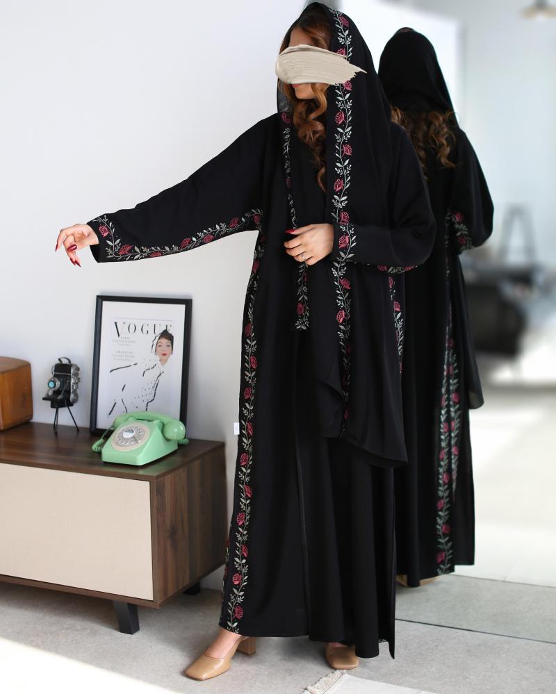 عباية سوداء عملية أنيقة بتطريز زهور من الأمام والخلف