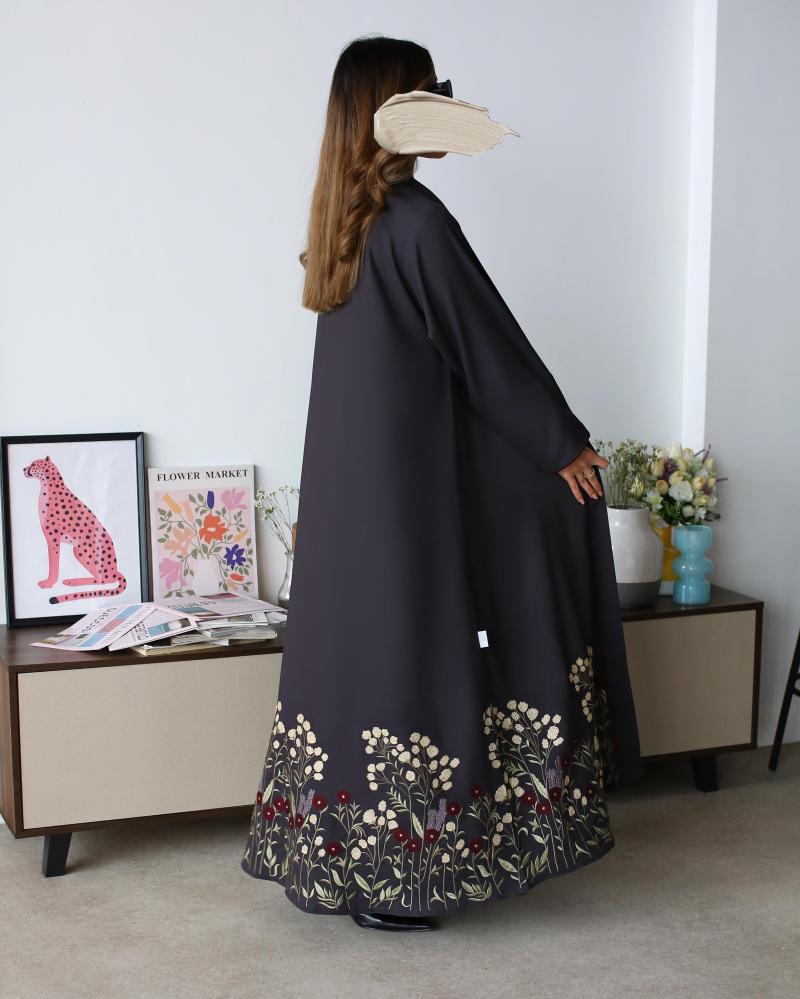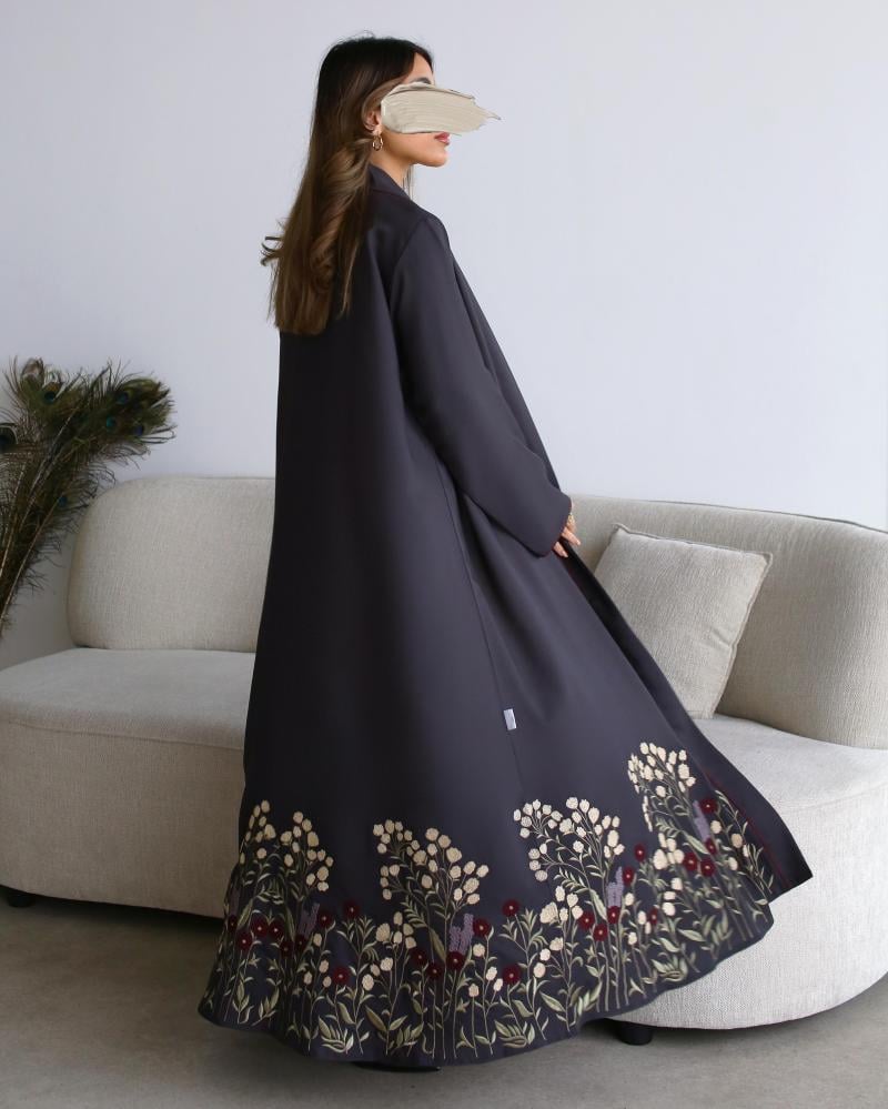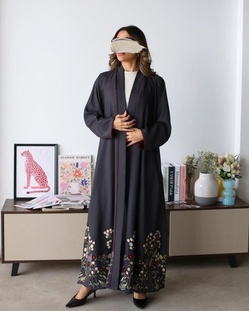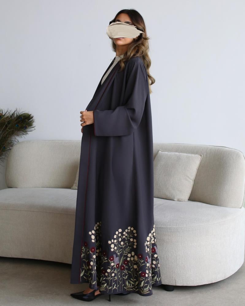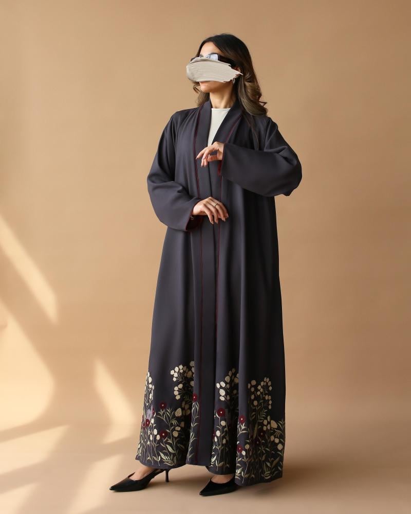 عباية باللون الرمادي الداكن مع أكمام مبطنة بالحرير العنابي مطرزة يدوياً من الأسفل
