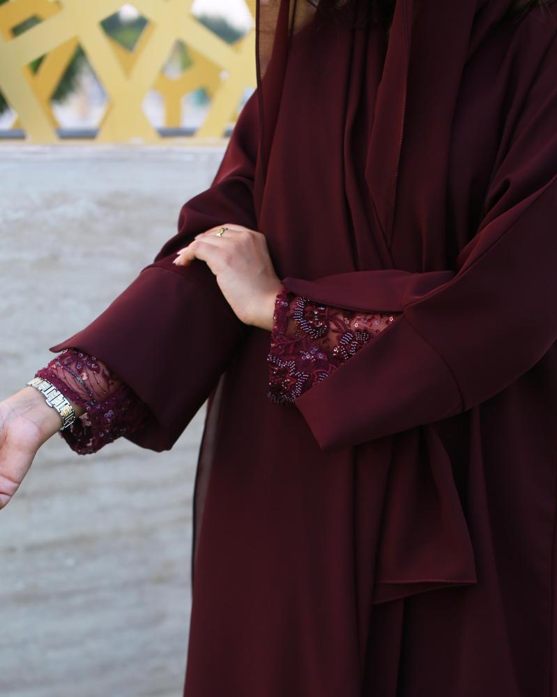 نوع القماش : كريب سيراميك مع تل مطرز بشك يدوي في الأكمام