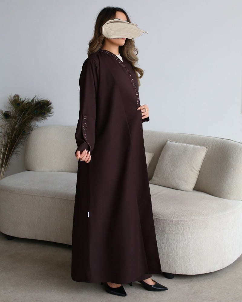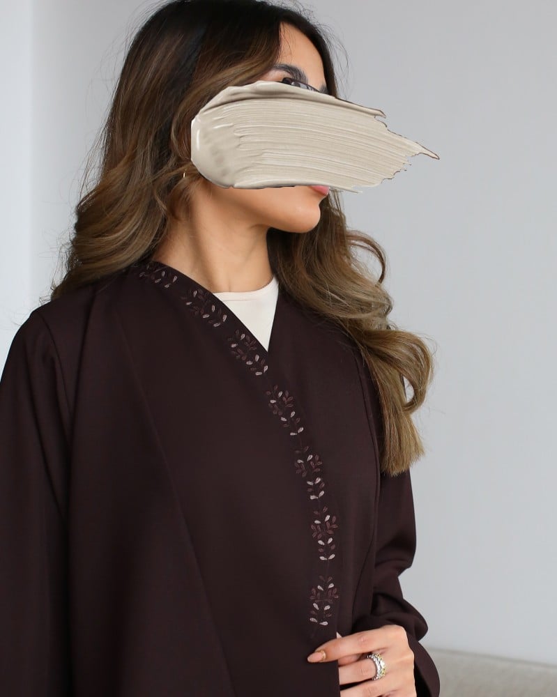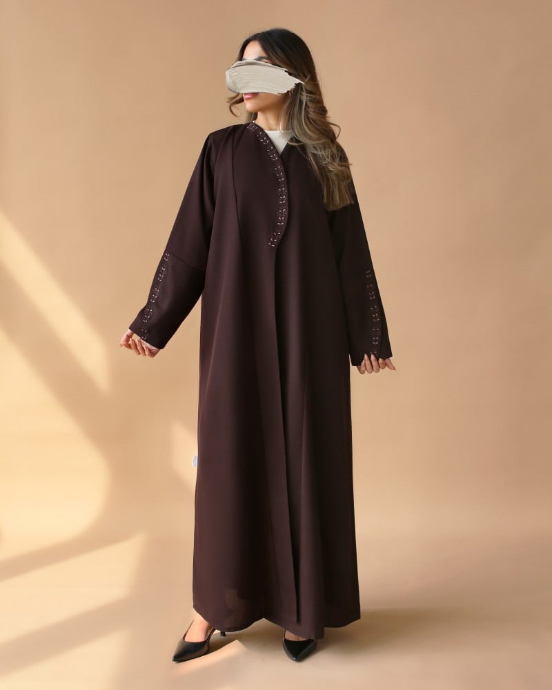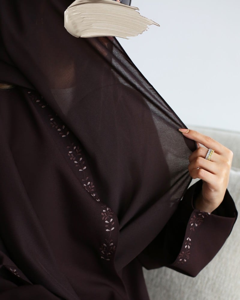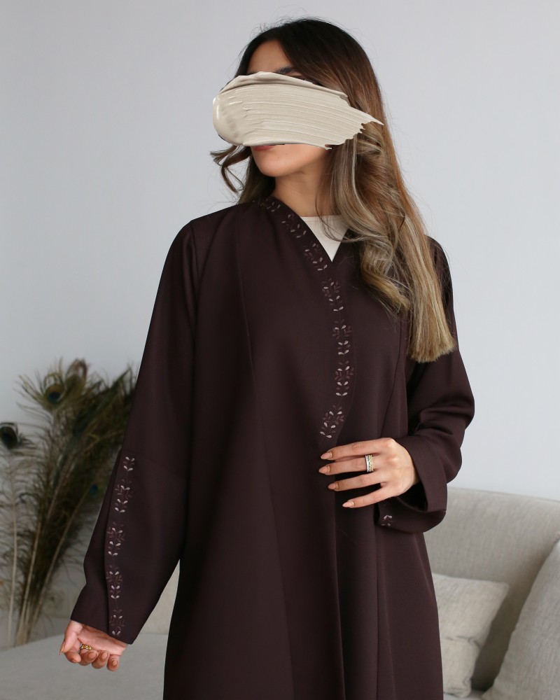 عباية عملية باللون البني الداكن مطرزة يدوياً تطريز ناعم