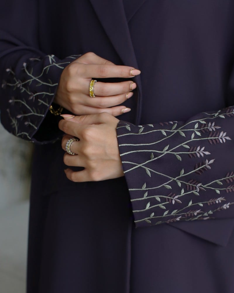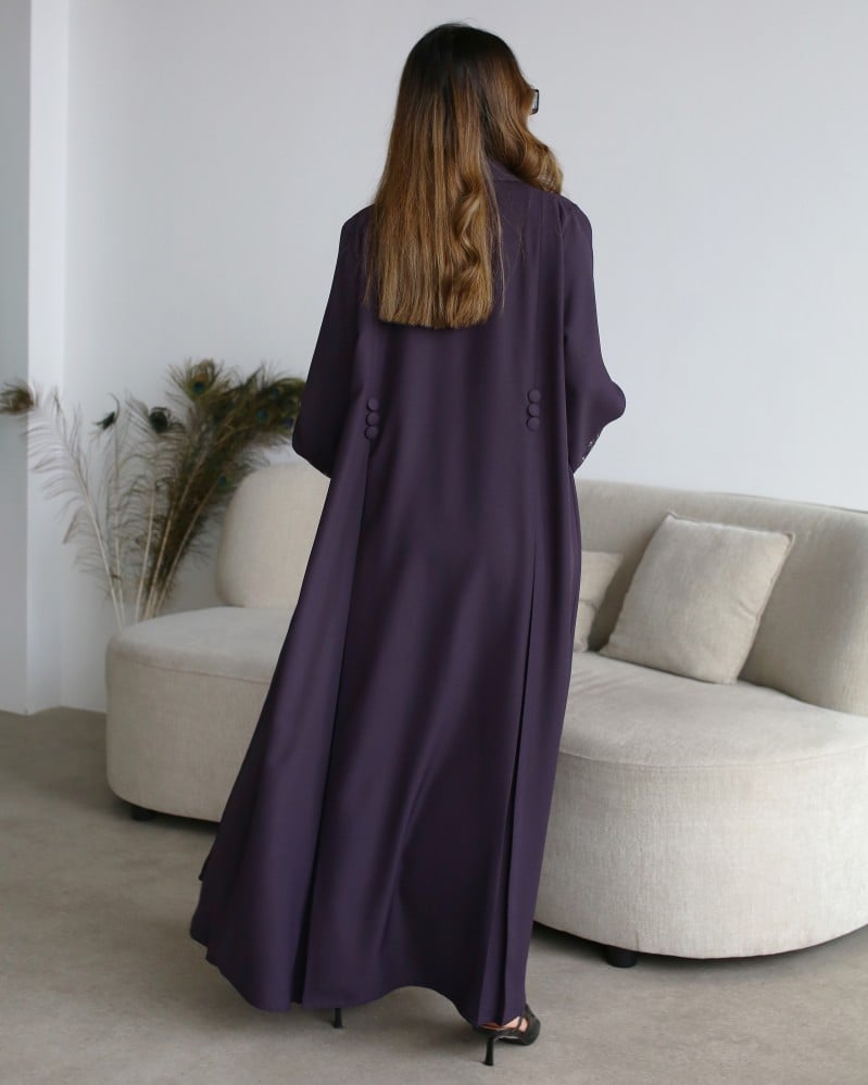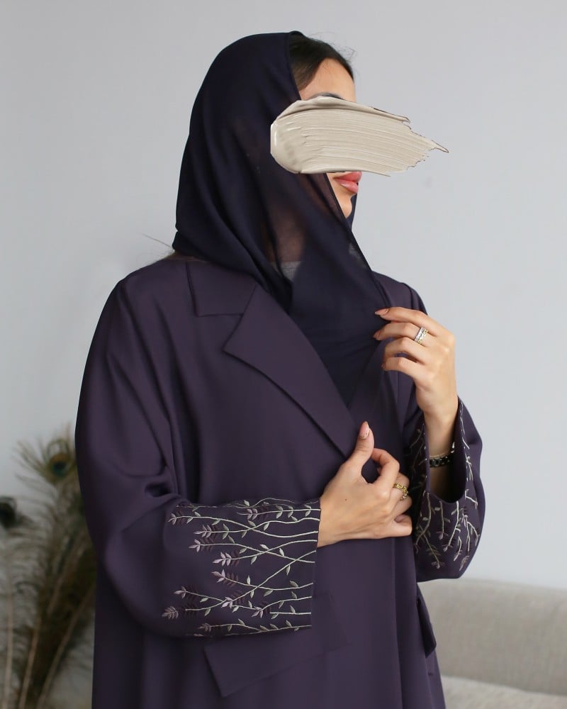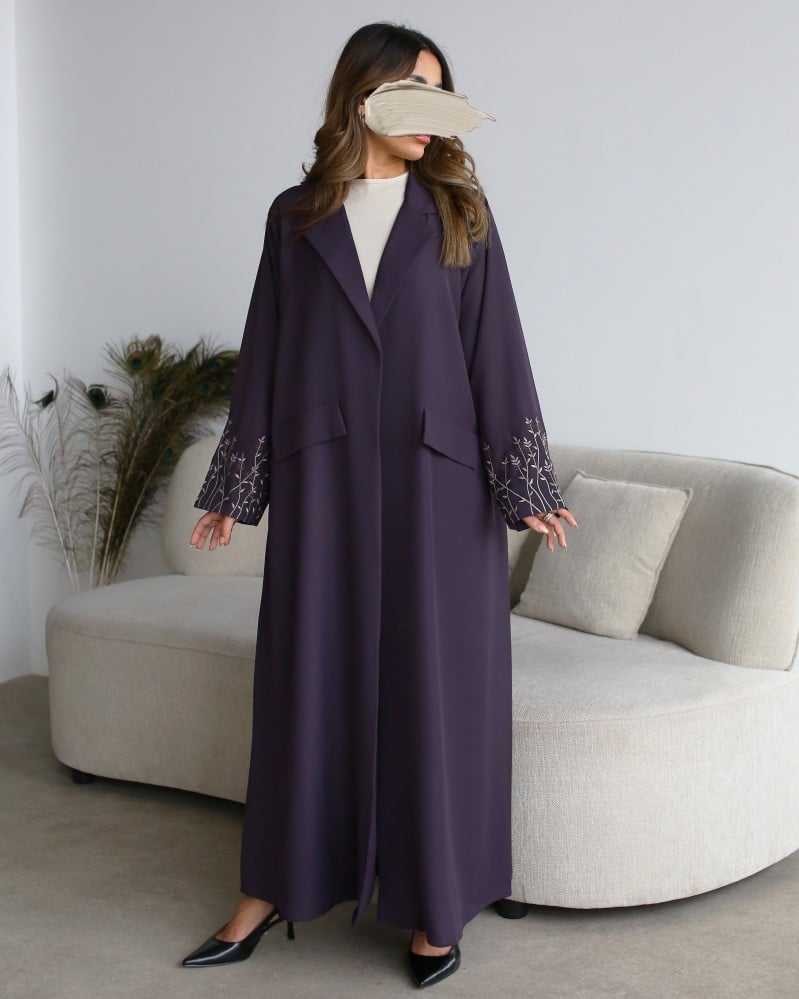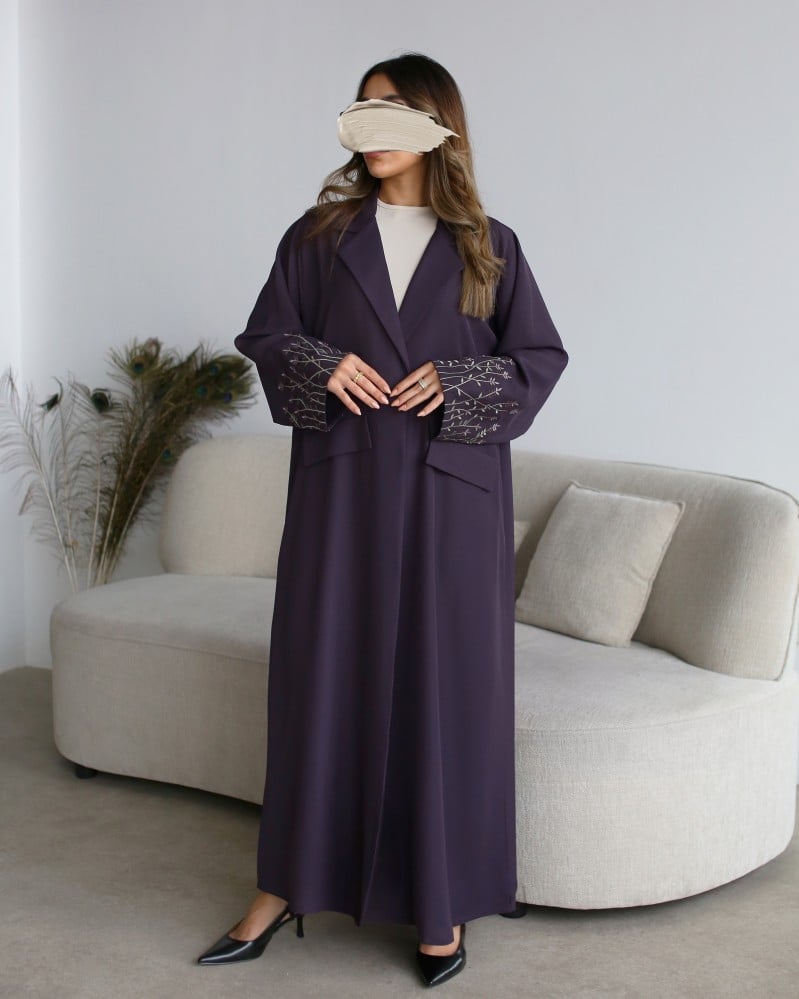 عباية عملية بتصميم كلاسيكي بدرجة البنفسجي الدخاني مع تطريز يدوي في الأكمام،