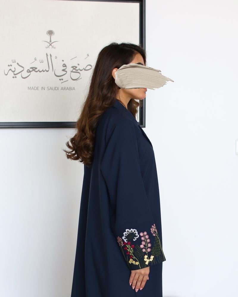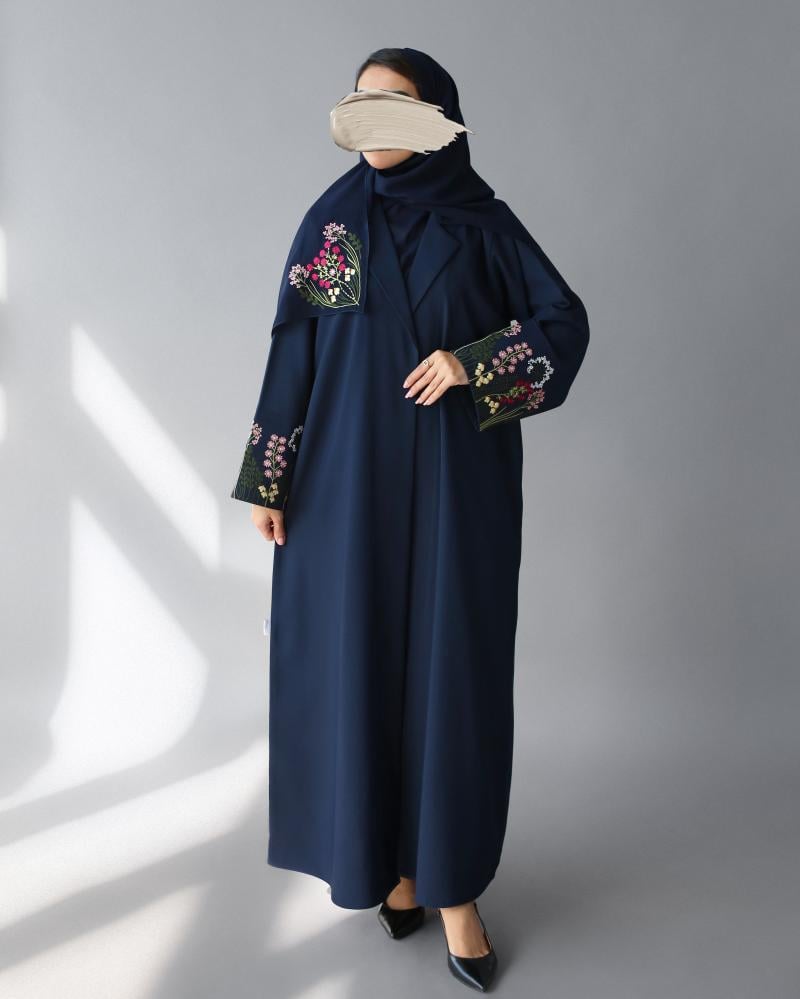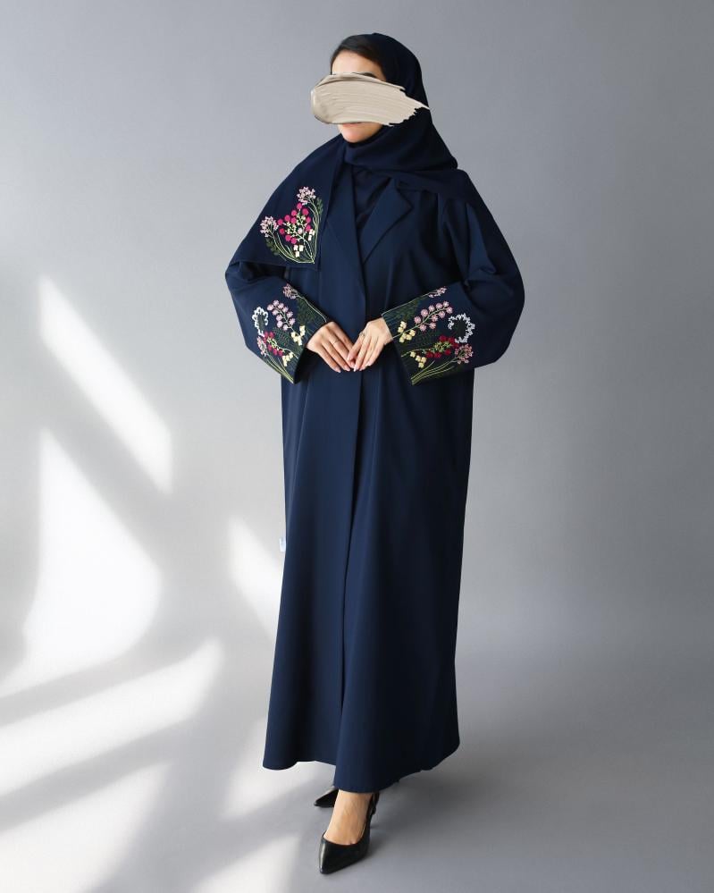 العباية باللون الكحلي الداكن، الذي يضفي إحساسًا بالعمق والأناقة، مما يجعلها خيارًا مثاليًا لمختلف المناسبات.
