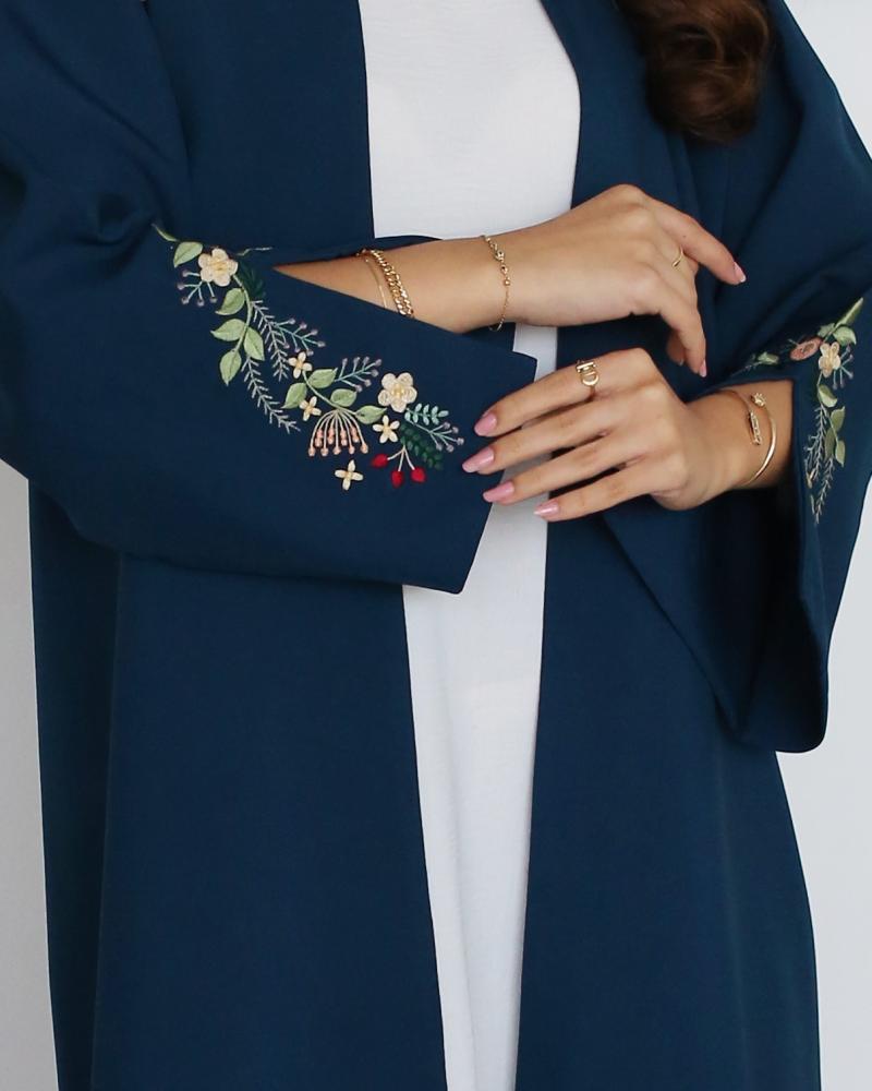 تتميز العباية بتطريز أنيق يمتد على ارتفاع الكتف من الأمام والخلف، وكذلك على الأكمام. هذا التطريز يتضمن تصاميم فنية دقيقة تضيف لمسة من الفخامة.