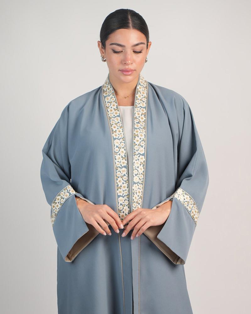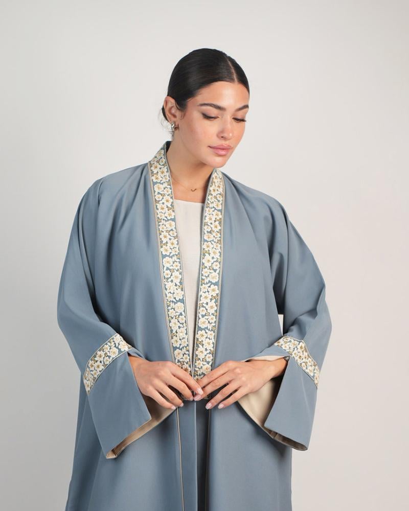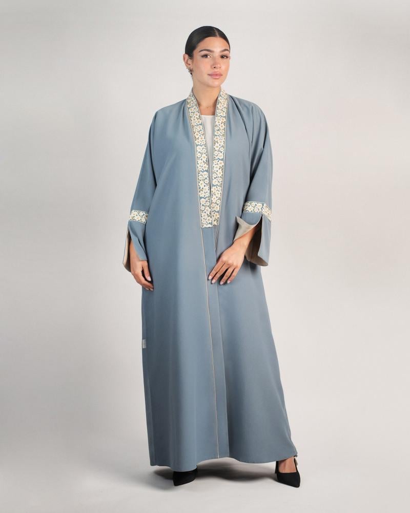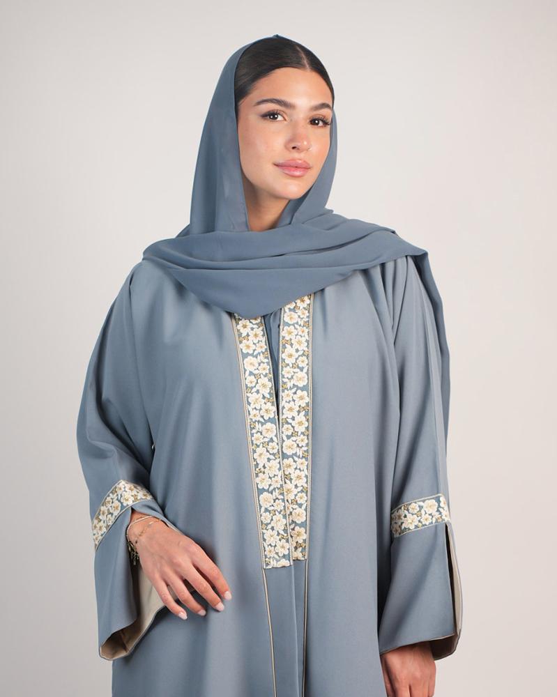 تتميز العباية بلون أزرق هادئ، مما يضفي شعورًا بالسكينة والأناقة. التصميم بسيط وأنيق، مما يجعلها مناسبة لمناسبات متعددة، من الاستخدام اليومي إلى المناسبات الخاصة.