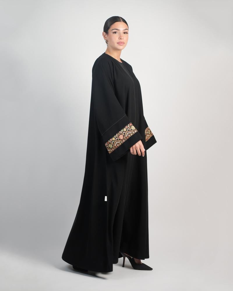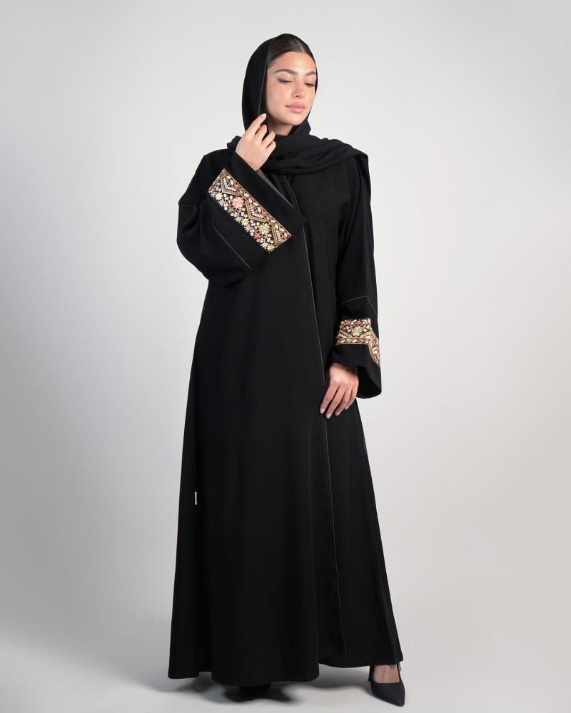 صُنعت العباية من خامة كريب أو شيفون خفيف، مما يضمن الراحة خلال الارتداء وتناسبها للاستخدام اليومي.