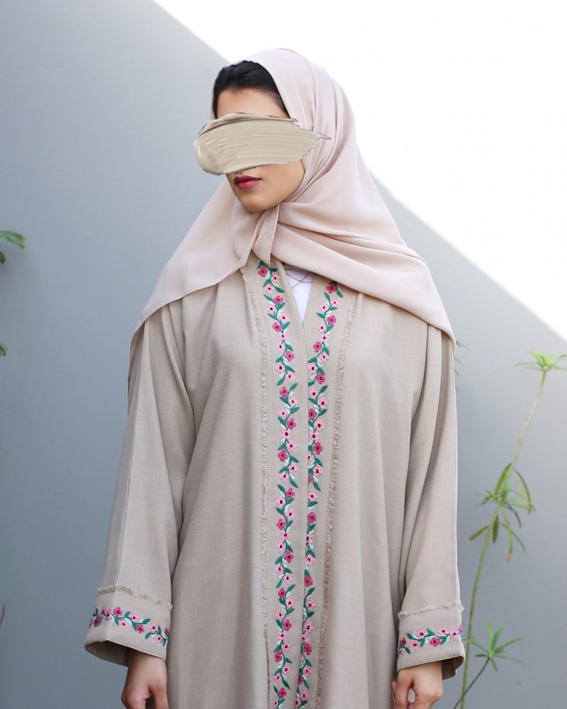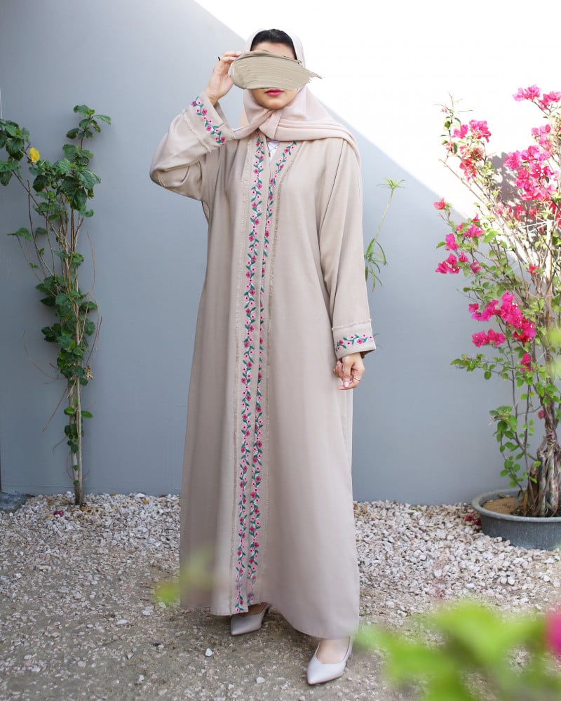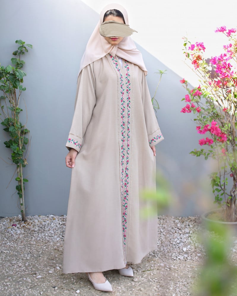 نوع القماش : لينن خيش صيفي + ( تطريز يدوي ) باستخدام خيوط القطن الفرنسي