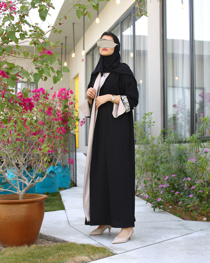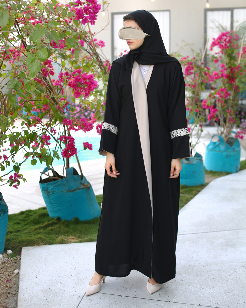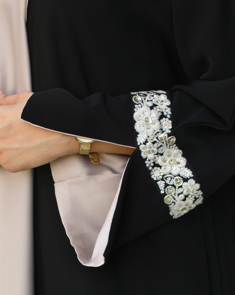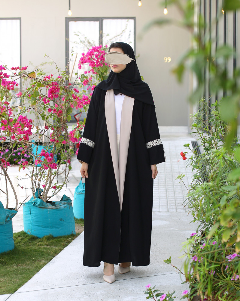نوع القماش : كريب أسود فاحم بكسرات من الخلف مع تطريز وشك يدوي، بطانة حرير من الأمام وداخل الأكمام