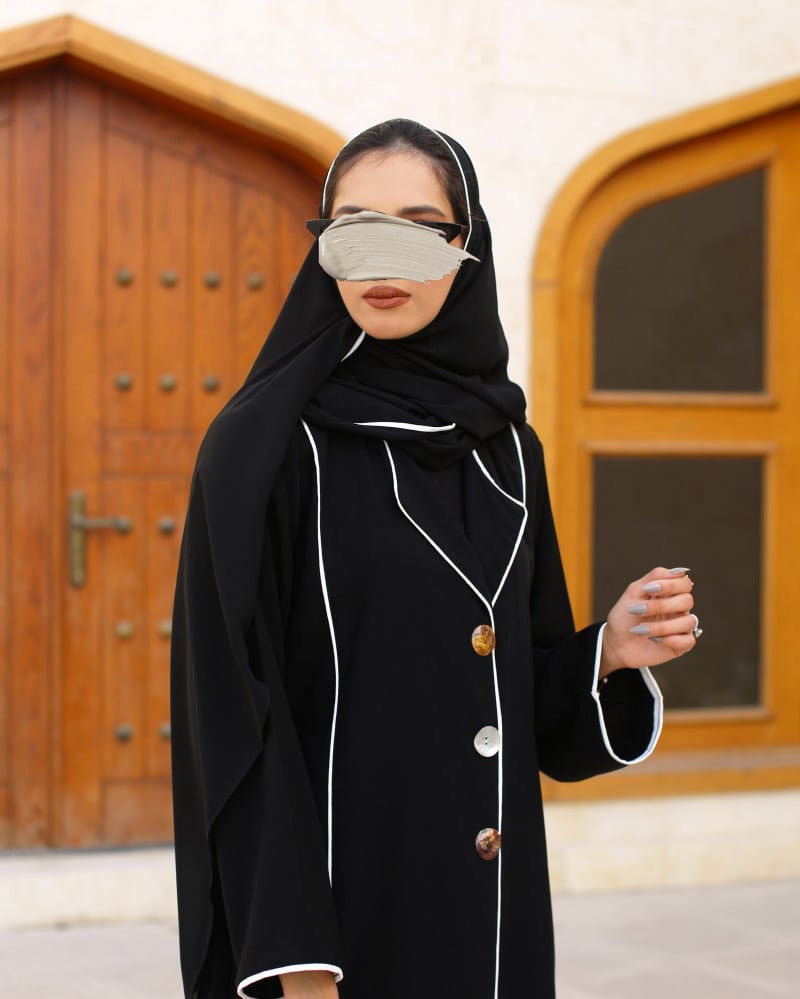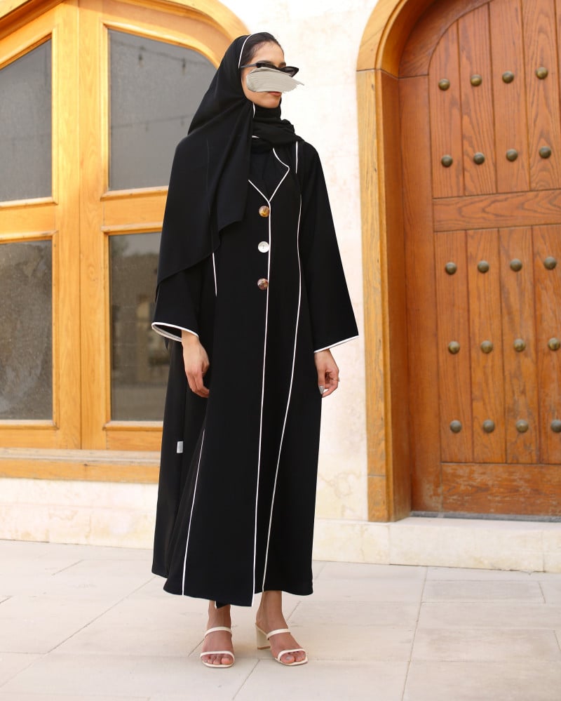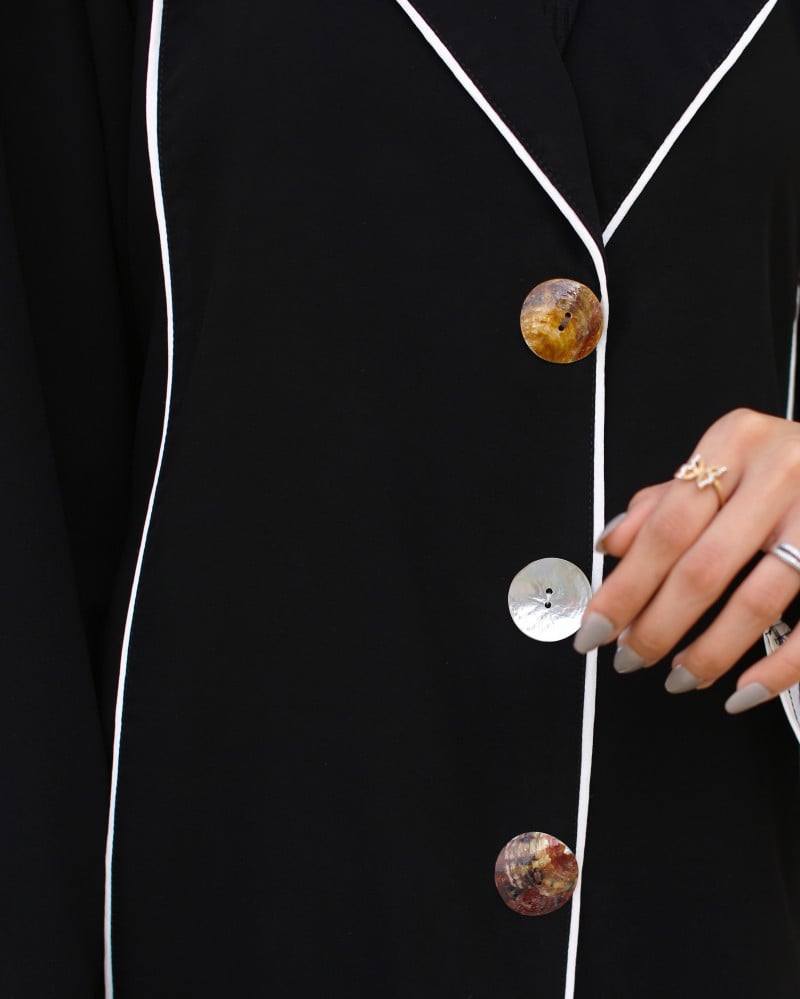 نوع القماش : أسود فاحم مع إضافة ازرار صدف من الأمام