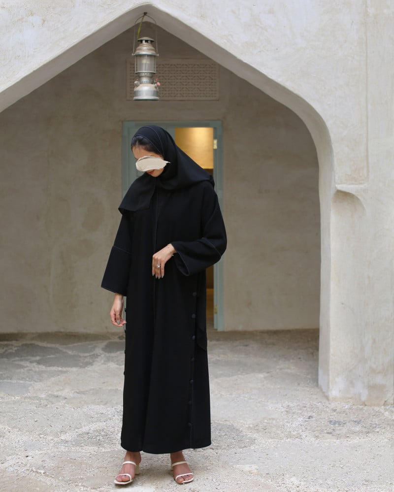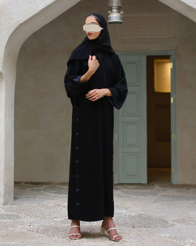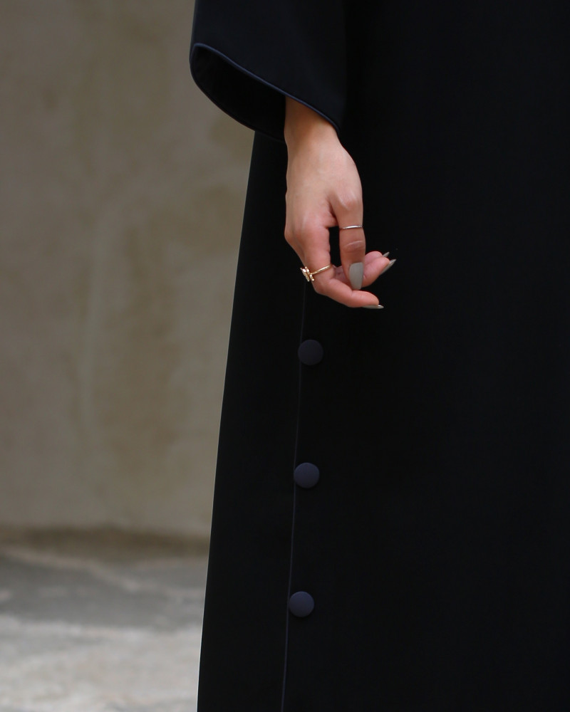نوع القماش : أسود فاحم مزين بخطوط وبطانة حرير كحلي تحت الأكمام و أزرار جانبية