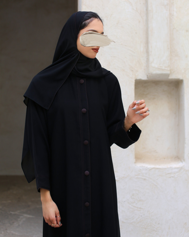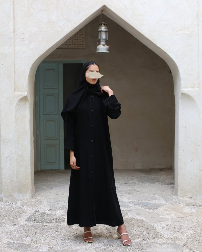 نوع القماش : أسود فاحم مزين بأزرار حرير من الأمام باللون البني
