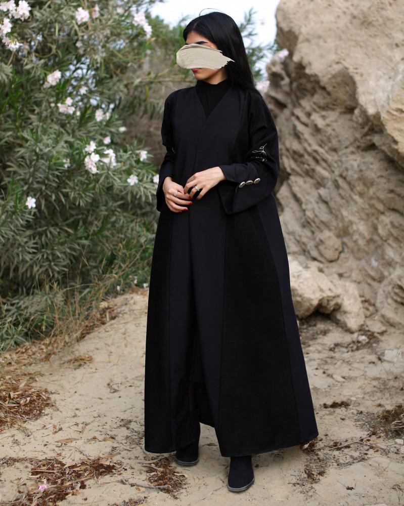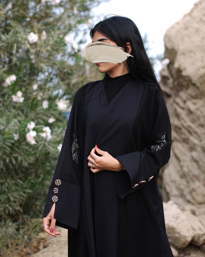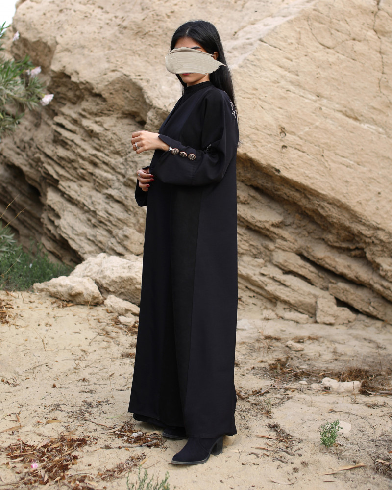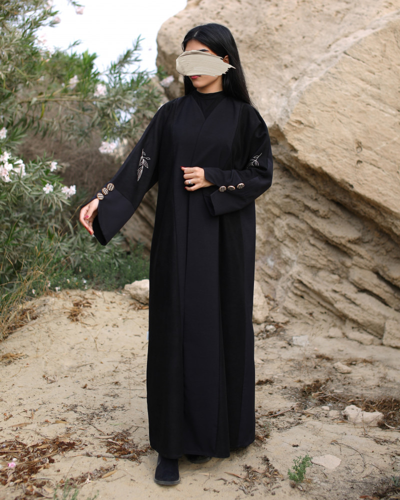 عباية سوداء مناسبة لفصل الشتاء ، مزينة بتطريز يدوي وأزرار قماش بإطار ذهبي في الأكمام