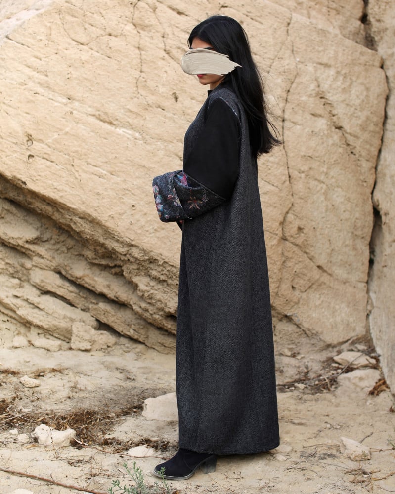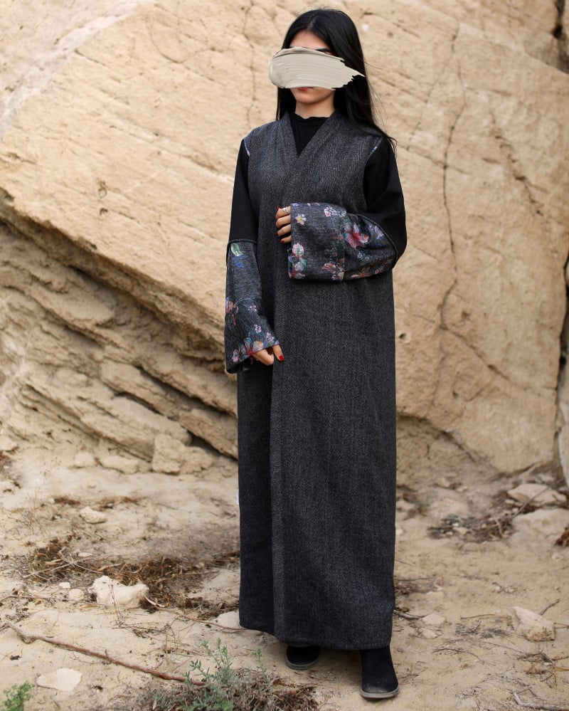 عباية شتوية مميزة بثلاث خامات مناسبة لفصل الشتاء ، مزينة بطبعات ورود في الأكمام